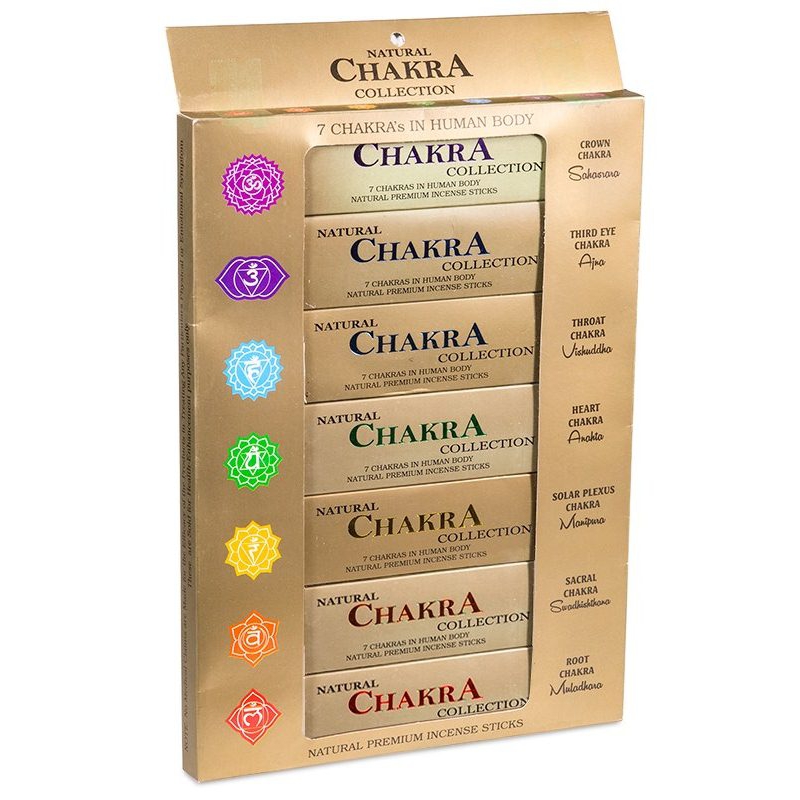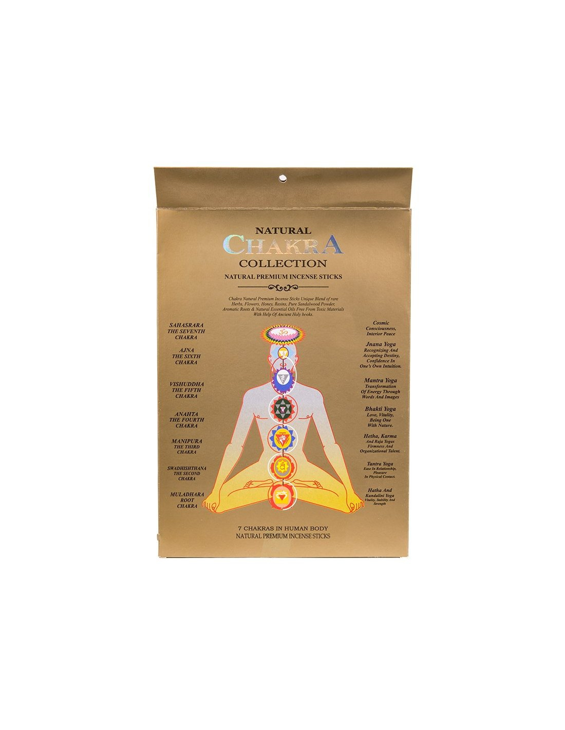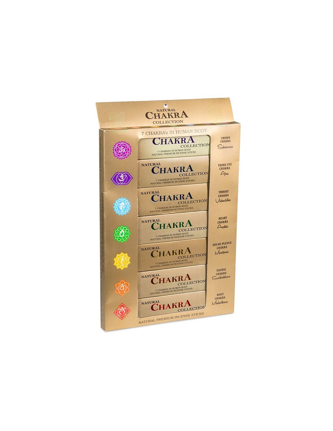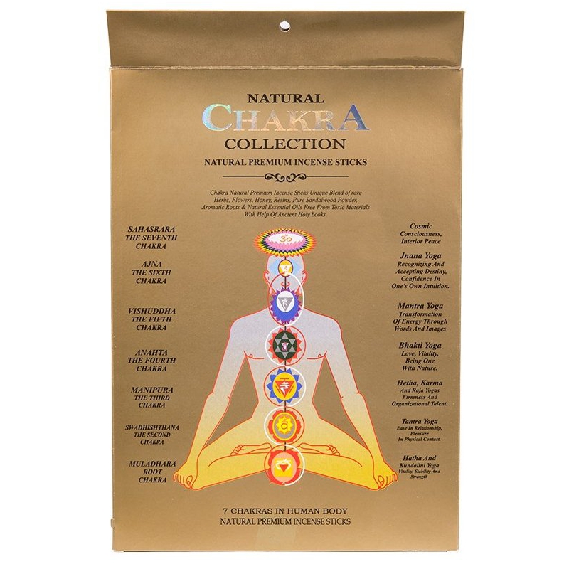 Een goudkleurige geschenkdoos met 7 pakjes Indiase wierook. 1 pakje voor elke chakra. 7 heerlijke geuren speciaal afgestemd om je chakra's te activeren, of om je te ontspannen. Deze natuurlijke wierook is een unieke mix van kruiden, bloemen, honing, hars, zuiver sandelhout poeder, aromatische wortels en natuurlijke etherische oliën.