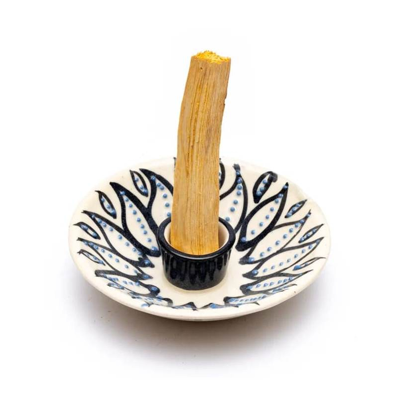 Een prachtig witte versierde wierookhouder, speciaal ontworpen voor het veilig branden van Palo Santo houtstokjes.